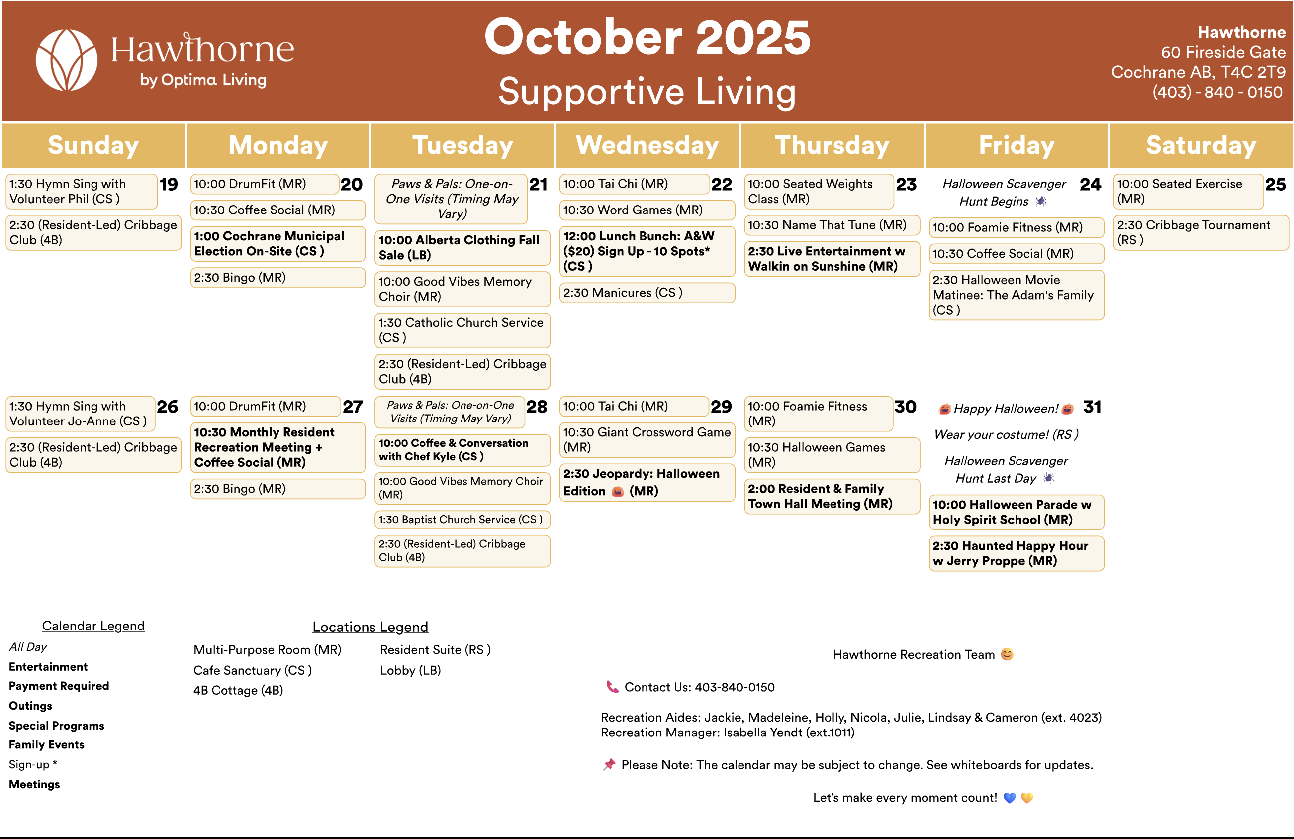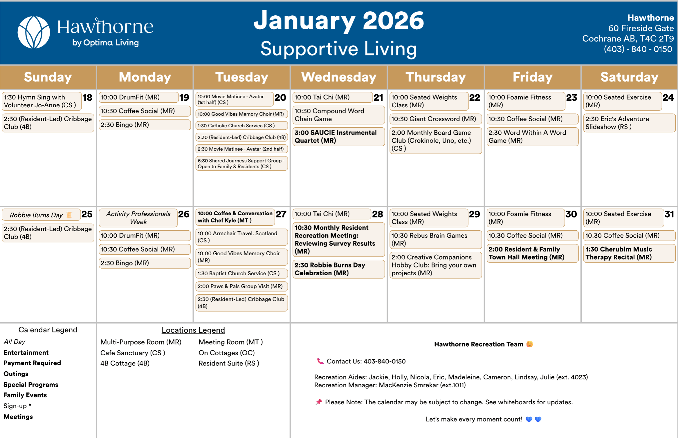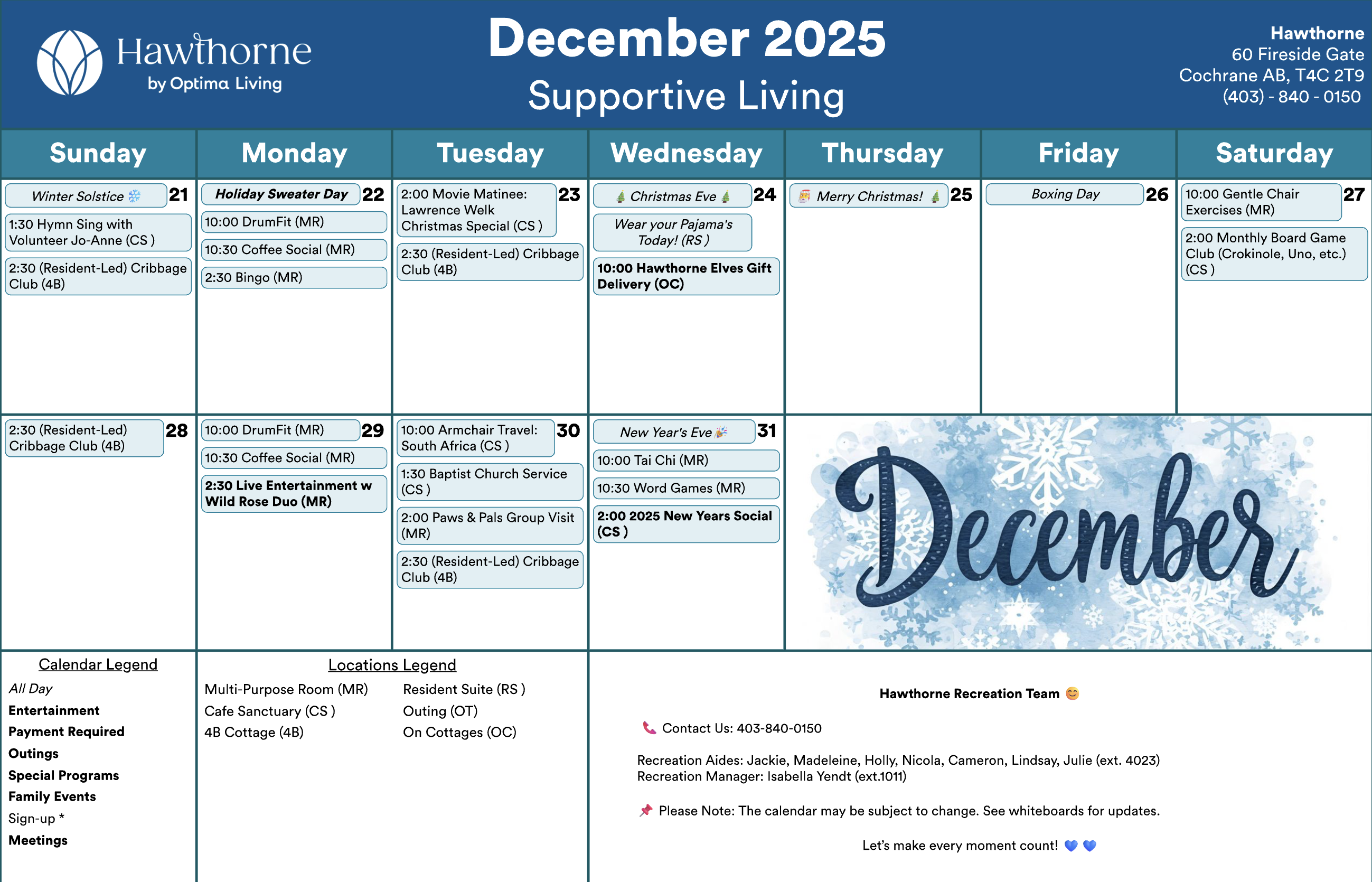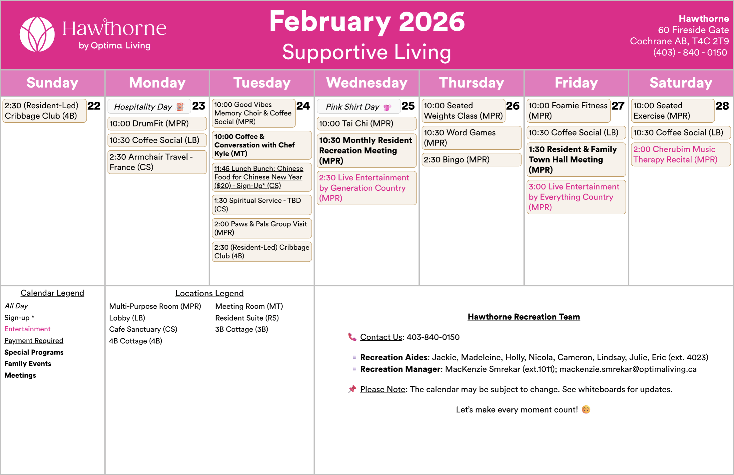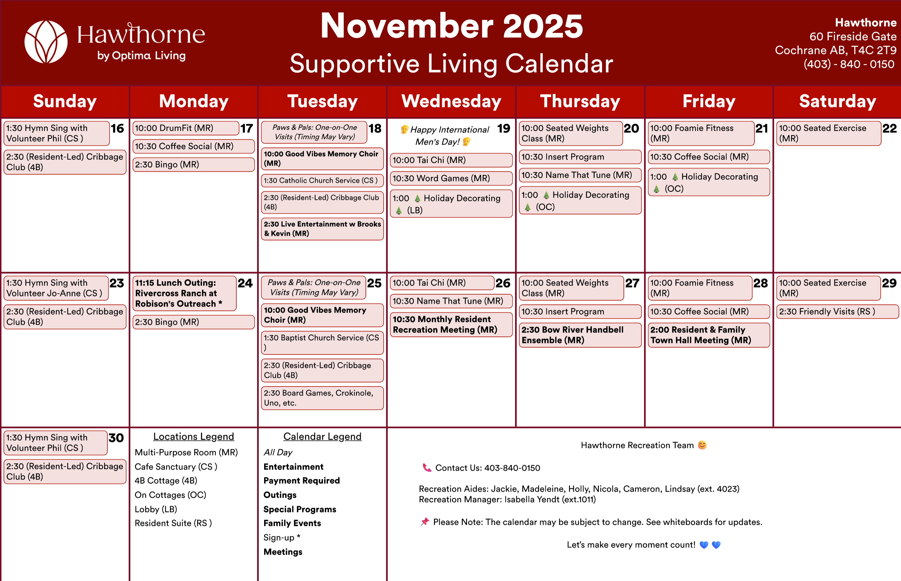 Any updates or changes will be posted on whiteboards in the residence! Calendar is subject to change.