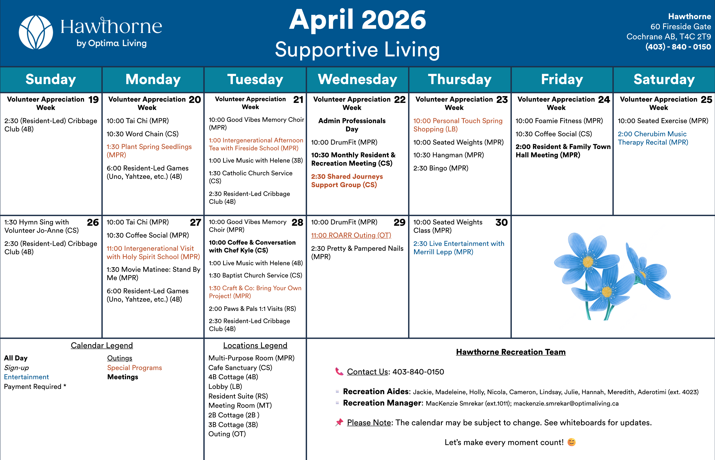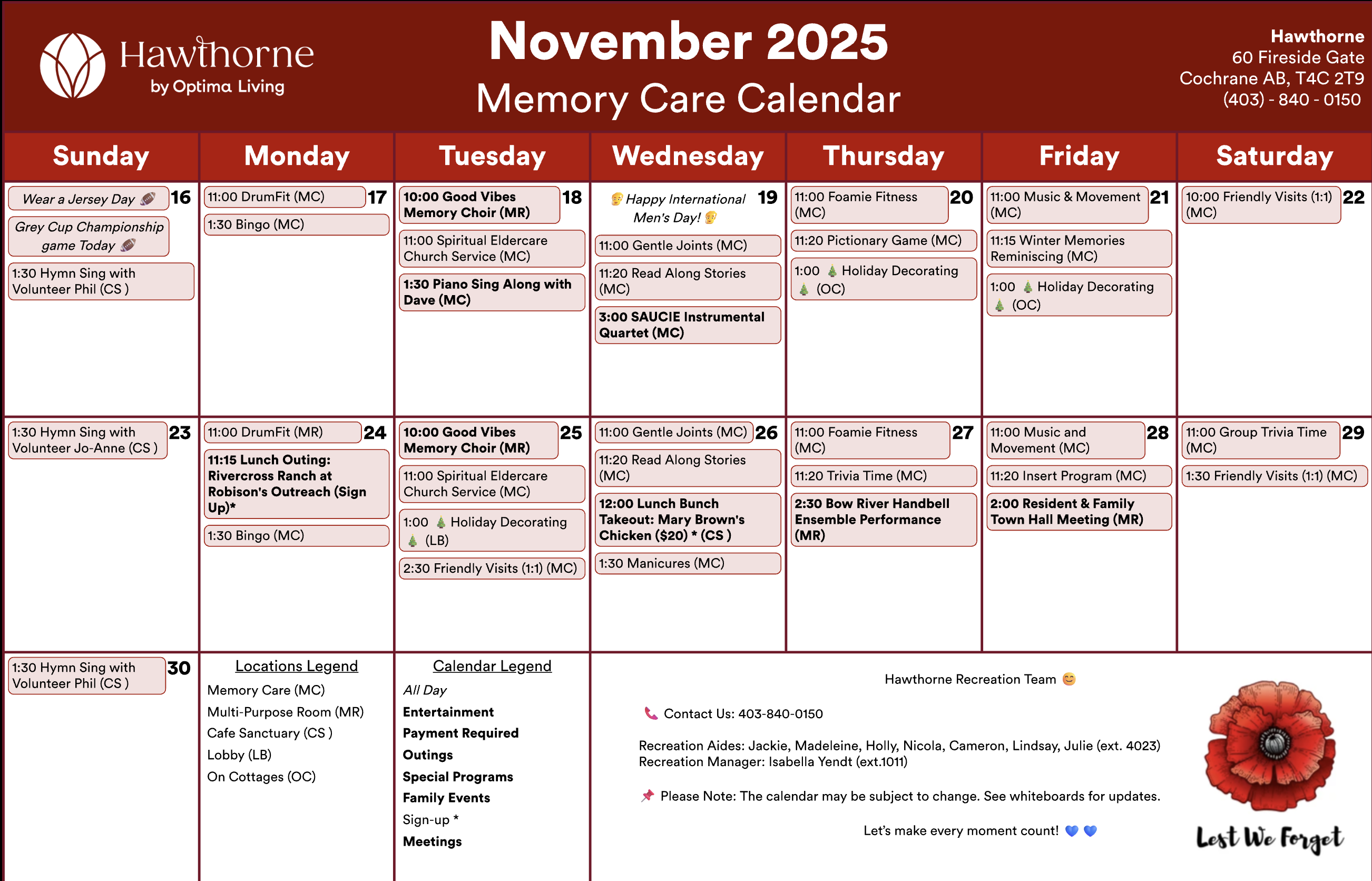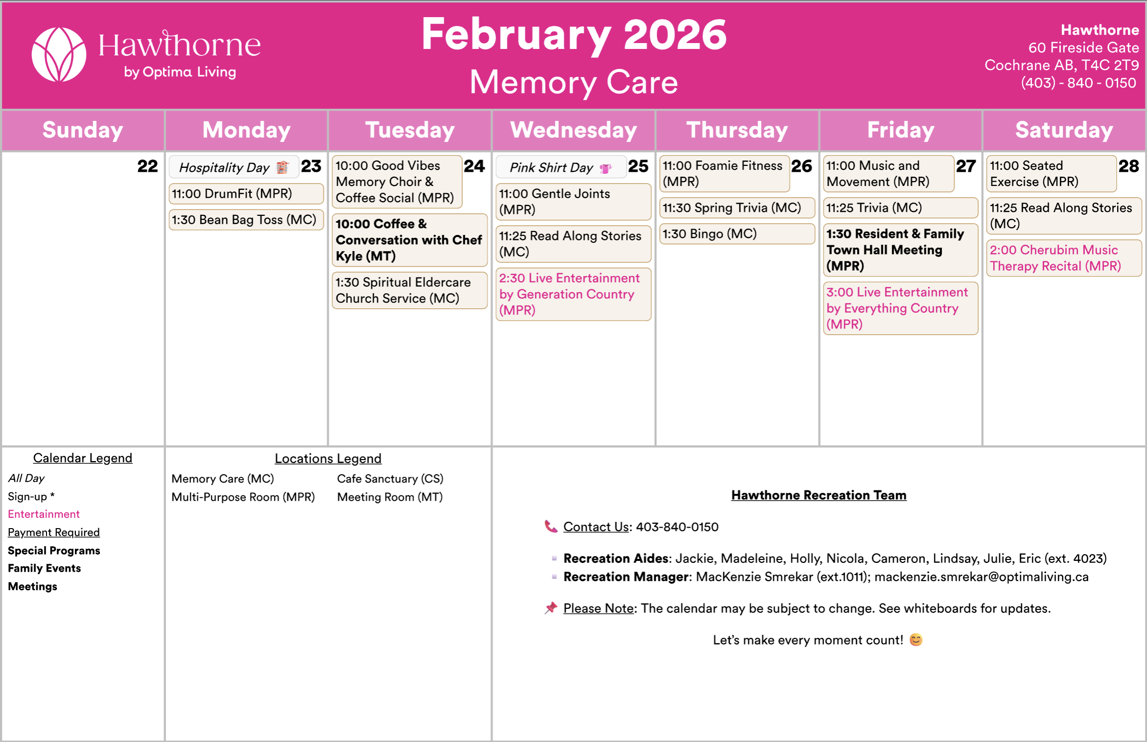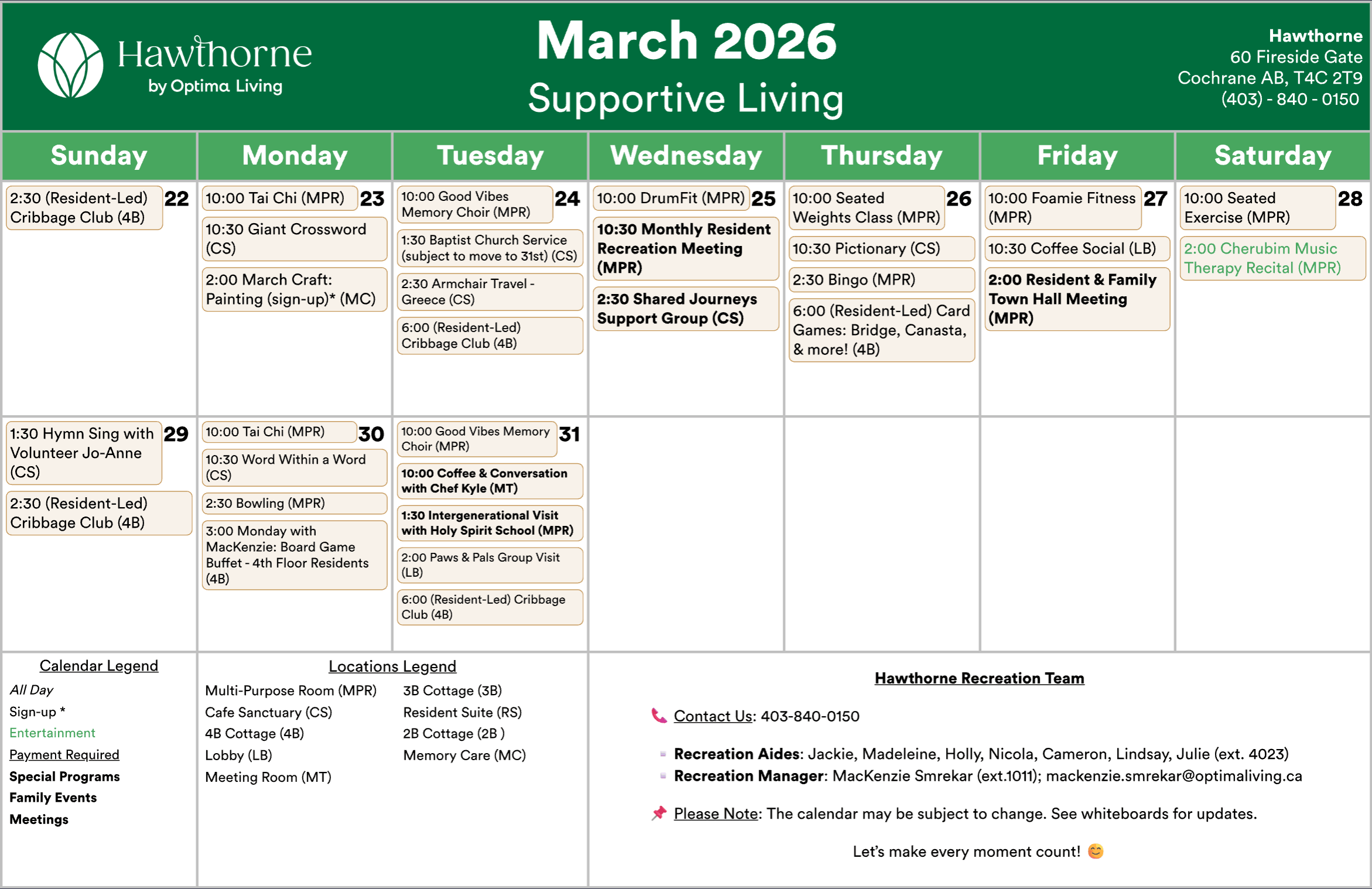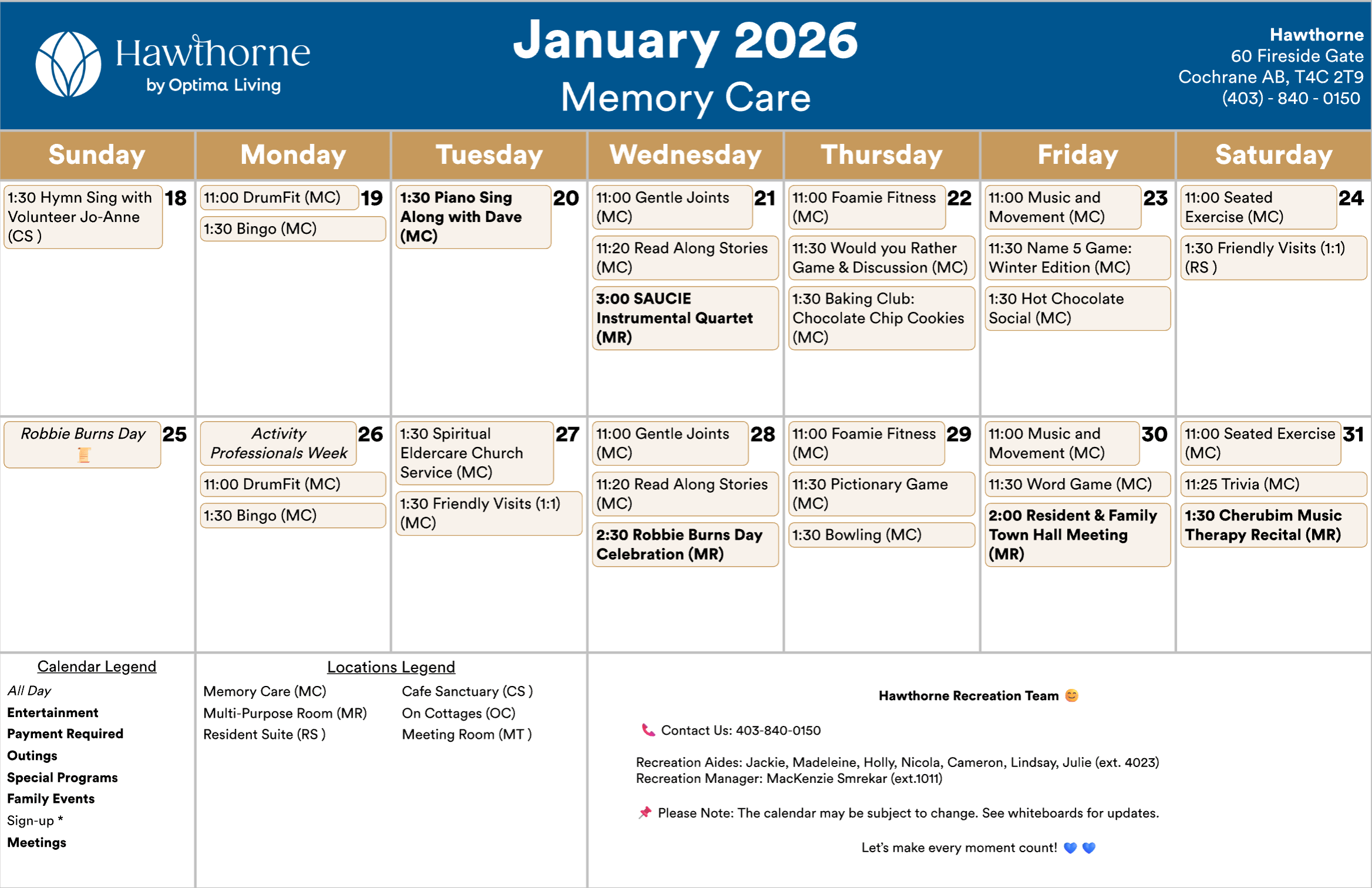 Any updates or changes will be posted on whiteboards in the residence! Calendar is subject to change.